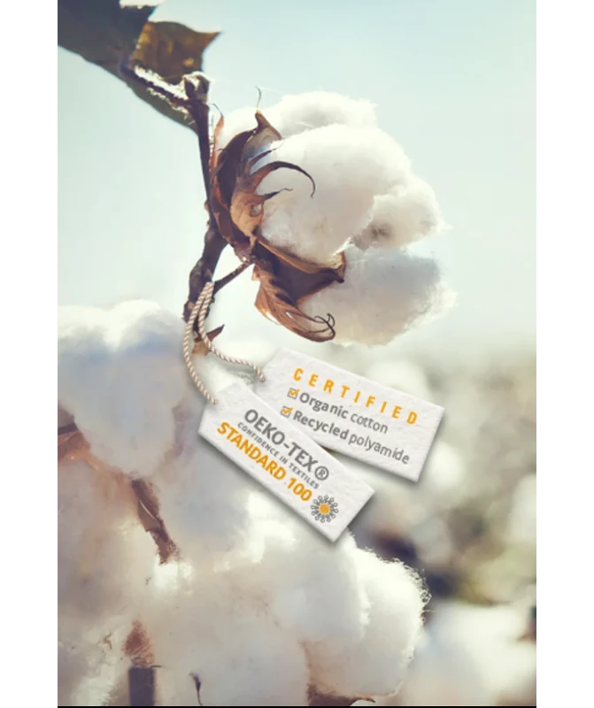 Composizione: 46% Poliammide (di cui 60 % riciclato), 27% Elastane, 27% Cotone biologico.