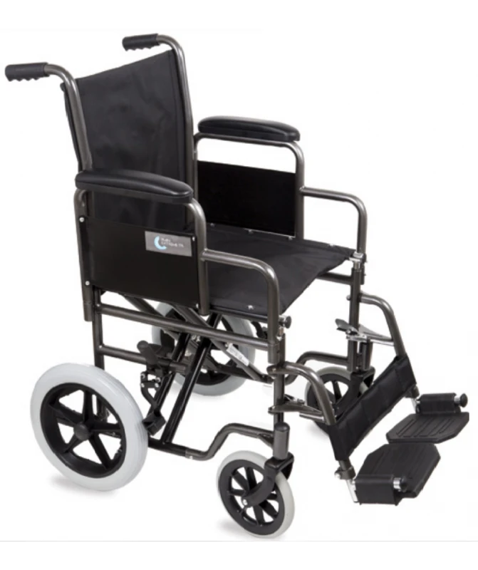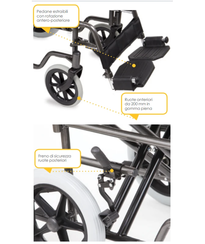 Telaio a doppia crociera. Ruote posteriori diametro 300 mm piene (PU). Braccioli ridotti (desk) estraibili. Pedane estraibili con rotazione antero-posteriore. Cinturino fermapiedi. Ruote anteriori diametro 200 mm in gomma piena. Sedile e schienale in nylon imbottito. Tasca portaoggetti sullo schienale.