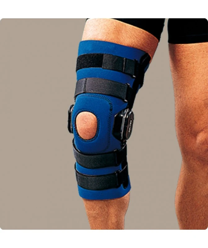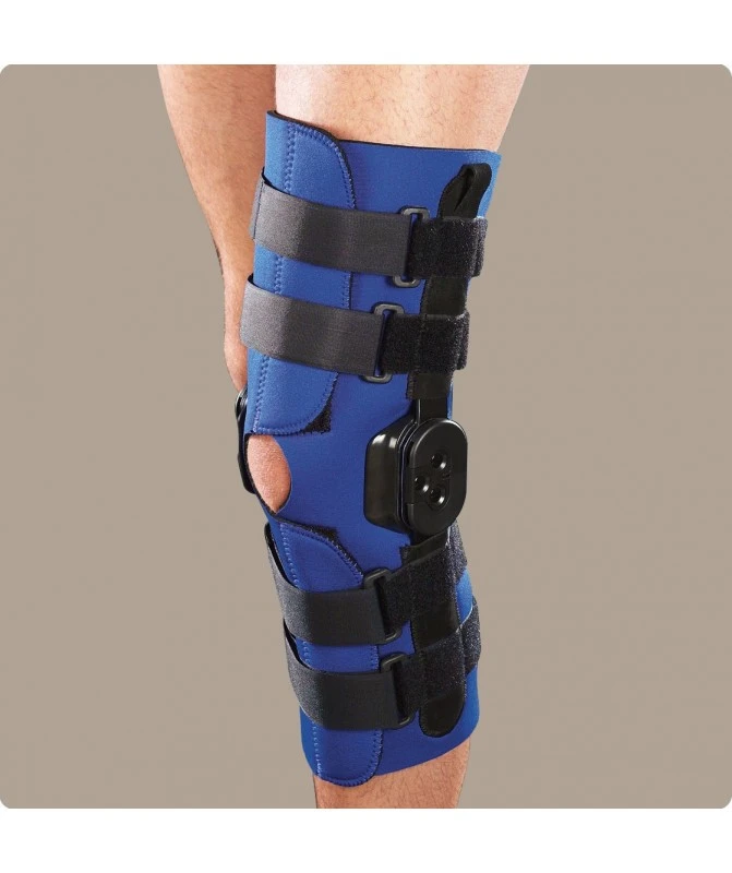 È un dispositivo medico, leggero e confortevole utile alla stabilizzazione latero/mediale del ginocchio. La struttura in neoprene svolge un’azione benefica e termoriscaldante, garantendo una naturale distribuzione delle forze di compressione. Le asole in pelle (presenti sulle guaine superiori) agevolano l’applicazione del tutore ed il foro a livello del cavo popliteo permette al sudore in eccesso di defluire, evitando il surriscaldamento ed eventuali irritazioni della pelle. Le aste articolate con possibilità di regolazione permettono, in caso di necessità, di limitare la flesso-estensione accompagnando e proteggendo l’articolazione durante il movimento. Di veloce applicazione, è indicato sia per la riabilitazione che per la normale attività sportiva.