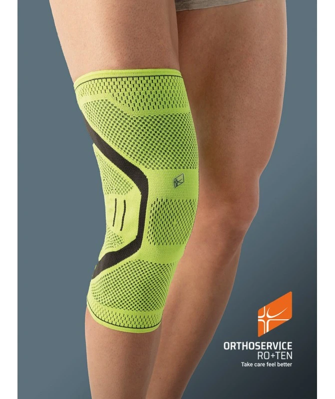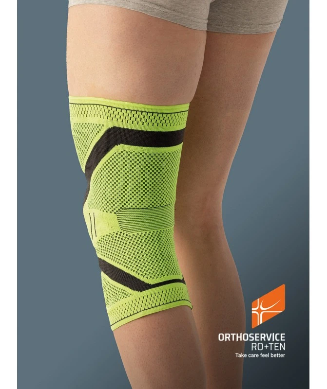 Caratteristiche: Struttura in maglia dinamica, con settori a compressione differenziata. Disegno anatomico. Stabilizzatore rotuleo in silicone. Sottili stecche laterali anti-migrazione per mantenere in posizione la ginocchiera. Bordo superiore rinforzato da un cordino in silicone per dare morbidezza e resistere alla trazione durante l’applicazione.