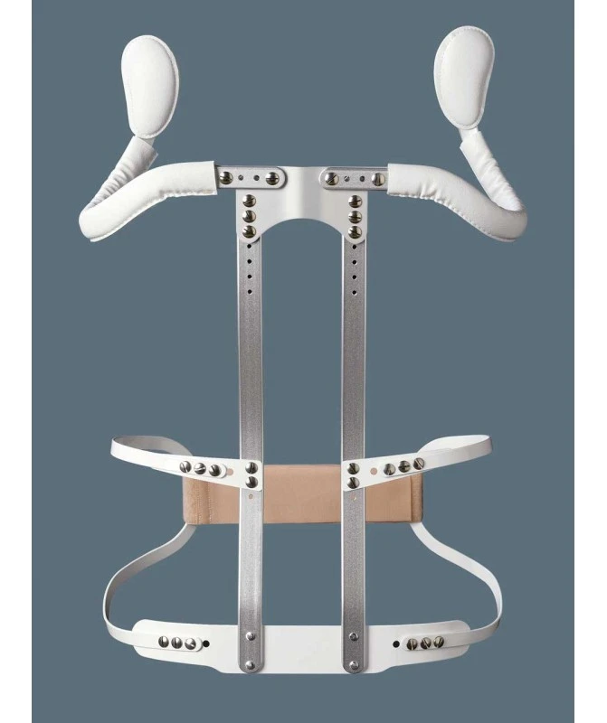 Caratteristiche: Struttura combinata. Telaio in lega leggera di alluminio. Busto sat semirigido con chiusura anteriore a velcro e sistema di tiranti elastici. Pelottine deltapettorali imbottite. Barre sottoascellari regolabili sulle aste montanti. Attacchi iliaci alle aste montanti. Disponibilità opzionale di 2 astine di collegamento iliaco-ascellare.