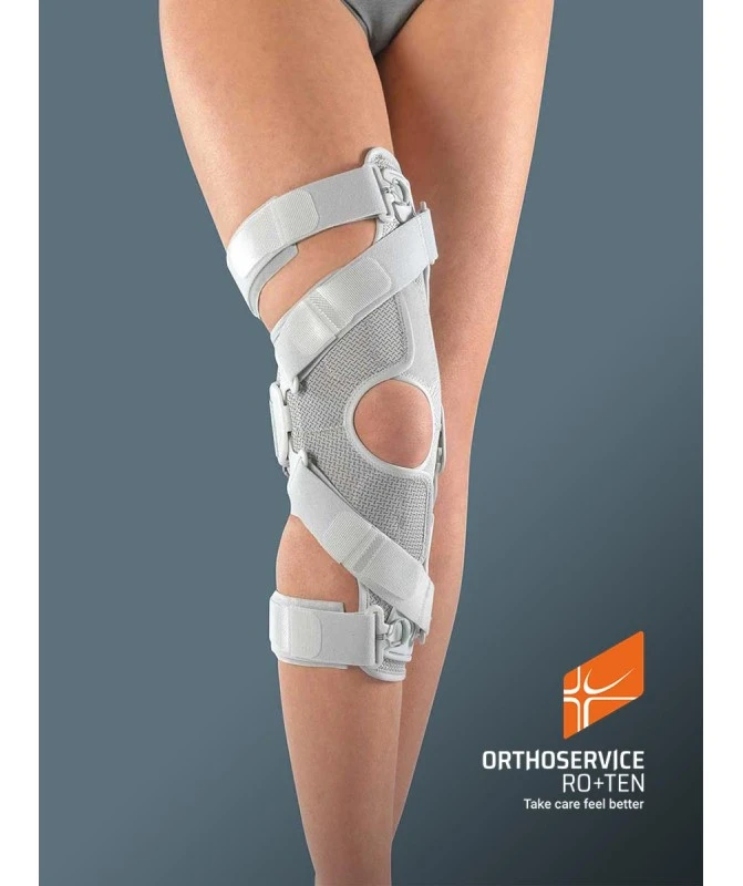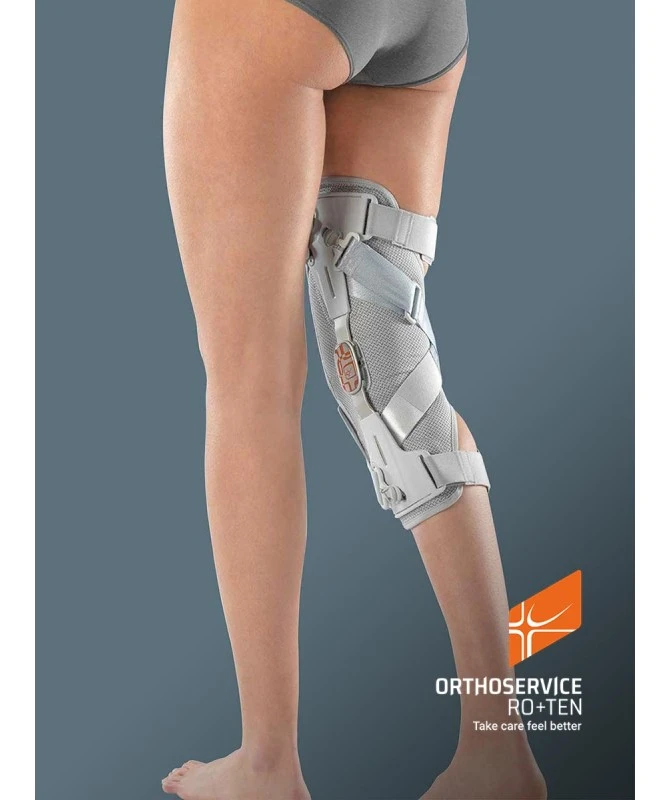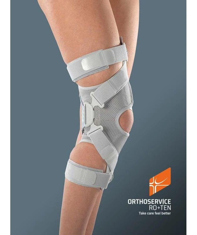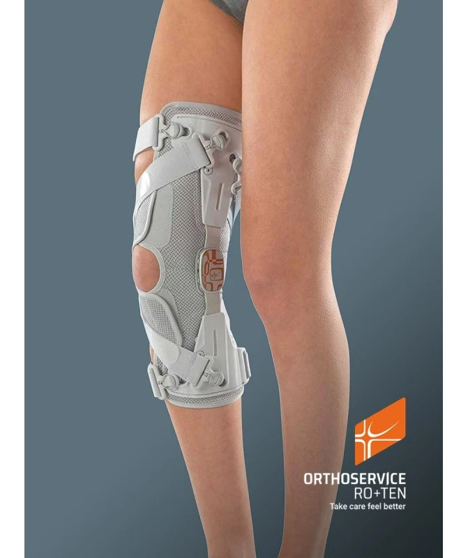 Caratteristiche: Sistema brevettato di cinghie: – efficace “alleggerimento” monolaterale del carico tramite sistema di spinta a tre punti – entra in funzione quando necessario: da seduti la pressione diminuisce, in posizione eretta il sistema di cinghie entra in tensione – facile tensionamento con sistema a verricello – facile regolazione. Base in tessuto elastico PlusComfort: internamente in cotone per il massimo comfort, esternamente in poliestere per la massima resistenza. Valve in tecnopolimero leggero e adattabile alla gamba, con sedi per aggancio fibbie. Asta monolaterale in lega leggera di alluminio, con possibilità di limitazione di flessione (0°,10°,20°,30°,40°) ed estensione (45°,60°,75°,90°). Fibbie a fungo con tiretto incorporato per facilitare il tensionamento; richiamo magnetico del tiretto per fissarlo dopo essere stato utilizzato. Imbottitura condilare in technogel per “dissipare” la pressione esercitata dal sistema di cinghie. Cinghie regolabili a misura tramite pratici velcri ad Y. Cinghie di coscia e polpaccio con elemento elastico per un maggior comfort durante il movimento; con imbottiture posizionabili a Velcro®.