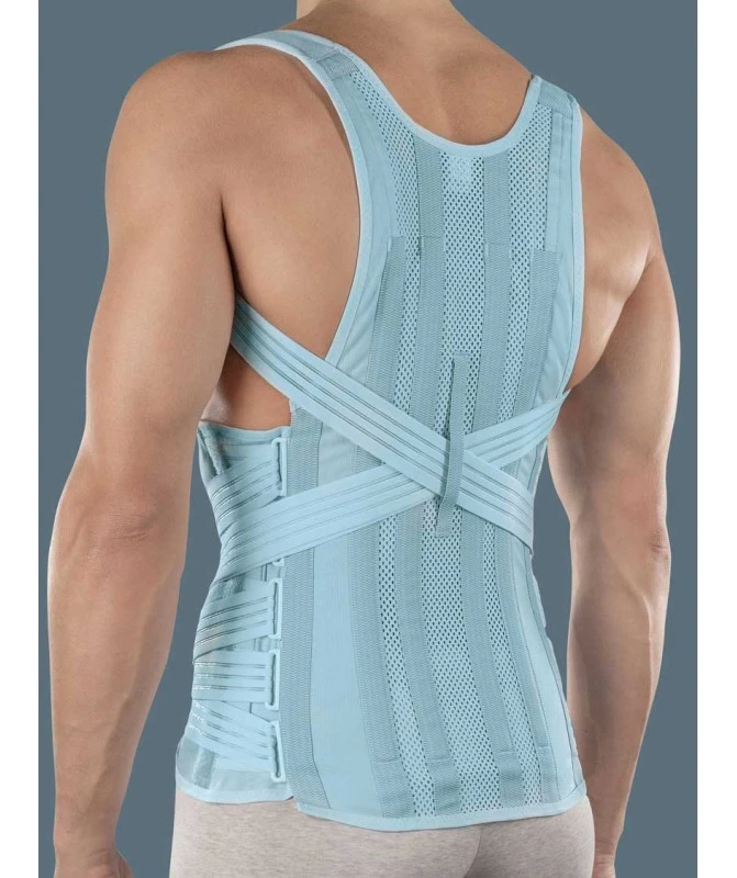 È un dispositivo medico, leggero e confortevole che sostiene il rachide garantendo un’ottima vestibilità col massimo comfort. I particolari tiranti elastici, dotati di nuove fibbie d’aggancio assemblate al tessuto, una volta tesi e posizionati, garantiscono che ogni centimetro del busto aderisca al corpo in modo perfetto. L’insieme delle forze che interagisce col tronco (spinta dorsale distribuita e controspinte a livello di spalle e bacino), oltre a sostenere la colonna, ne limita anche l’escursione, raddrizzandola nei limiti del possibile. Il nuovo inserto posteriore in rete anaelastica, intervallata alle 4 guide per le stecche, assicura maggior tenuta e anche una migliorata traspirabilità. Disponibili nei nuovi colori crema e azzurro. Opzionale: 9ST012 stecca rinforzata addizionale cm 38.