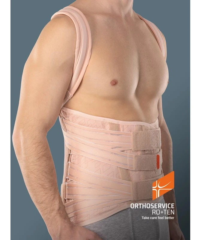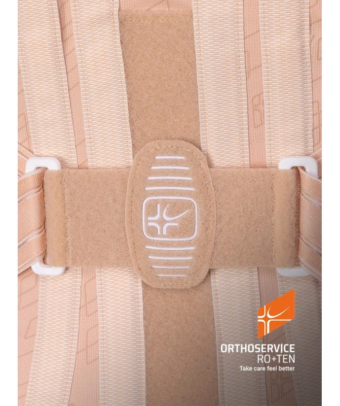 Sistema di trazione: tiranti elastici rinforzati per una pressione mirata e una perfetta stabilizzazione del tratto lombosacrale; latex free; carrucole per avere una chiusura efficace col minimo sforzo; puntali in materiale polimerico morbido, per facilitare sia la presa che la rimozione del tutore; spalline con ascellari imbottiti; chiusura anteriore a Velcro®, con comoda presa per facilitare la chiusura. Sagomata per avere il massimo comfort