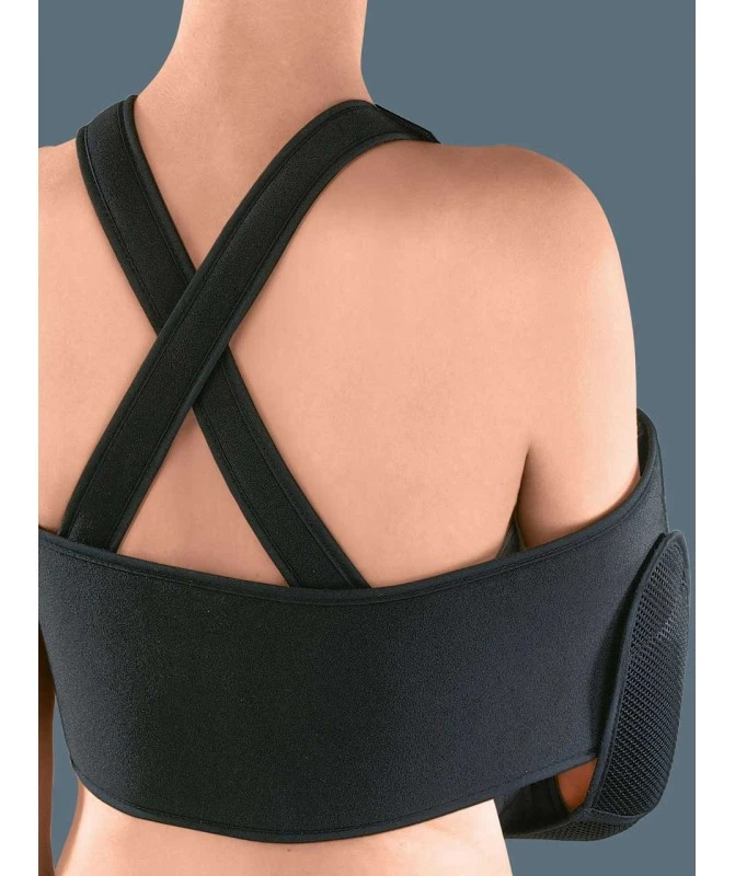 È un dispositivo medico, pratico e affidabile, che assicura un’ottima immobilizzazione dell’articolazione della spalla. È costituito da una sacca reggibraccio, 2 bretelle, una fascia contenitiva e da un’esclusiva fascetta blocca-gomito. Le 4 componenti, grazie alla loro struttura e al tessuto velcrabile, consentono di regolare l’ortesi in modo ottimale su qualsiasi costituzione, per ottenere la posizione braccio-spalla più corretta, mantenendola inalterata giorno e notte. La fascetta blocca-gomito, in particolare, evita lo scivolamento esterno del braccio, anche dopo molte ore e durante il sonno. Intuitivo nell’applicazione, si indossa e si sfila in pochi secondi e senza alcuna difficoltà. Radiotrasparente.
