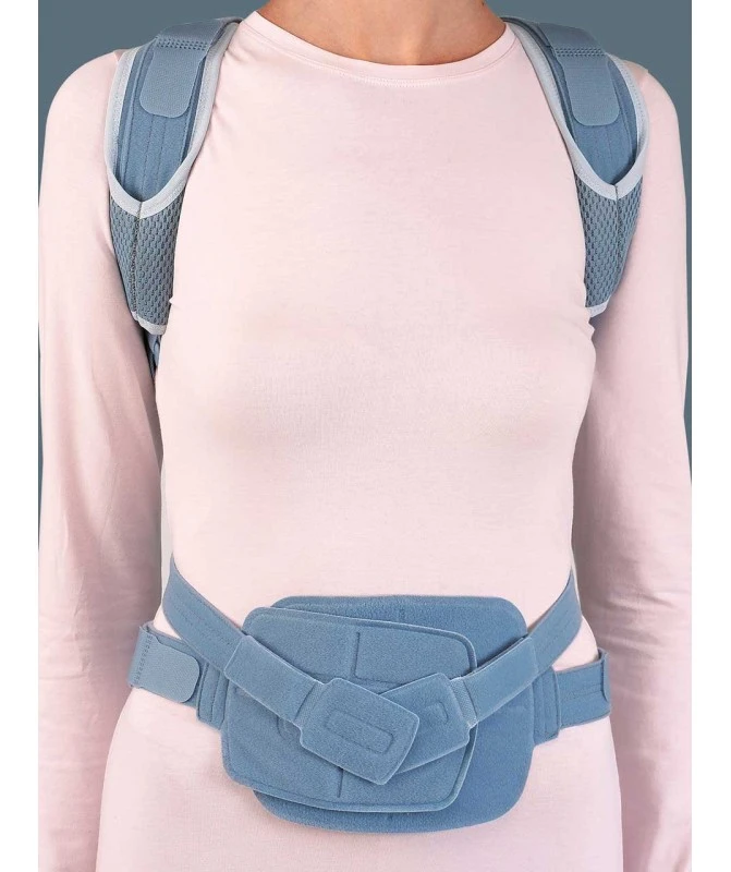 Caratteristiche: Spallacci con imbottiture con posizione predeterminabile. Chiusura a velcro. Inserto elastico ad effetto bio-dinamico. Struttura interna modellabile in lega di alluminio radiotrasparente. Tiranti dorso-addominali con cinghia a basso attrito. Fibbie con punto di ancoraggio auto-orientante. È un’ortesi di ultima generazione coperta da brevetto.