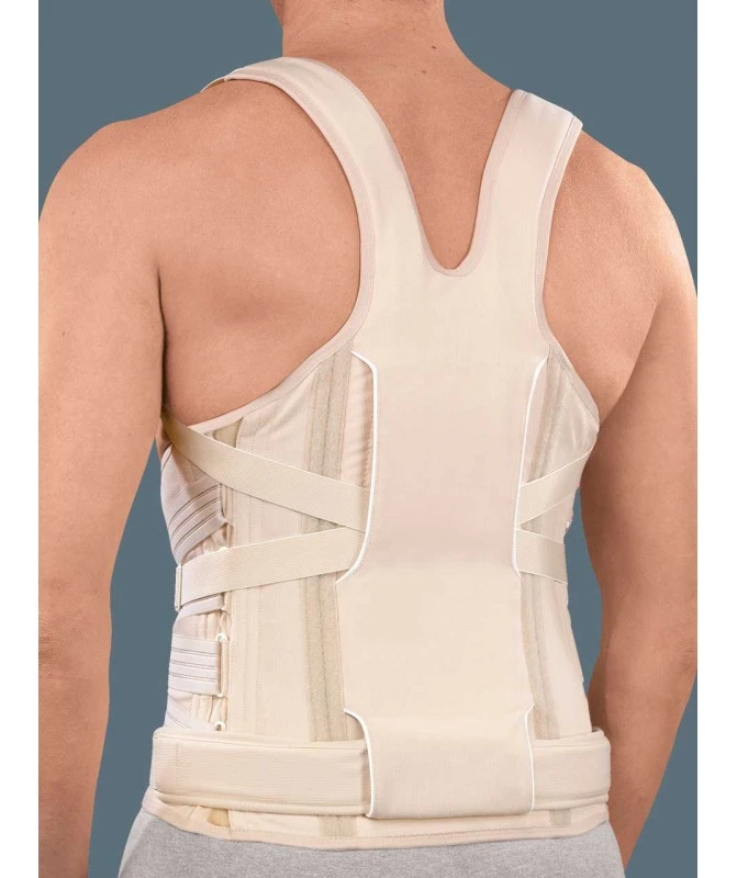Caratteristiche: Struttura del busto in tessuto traspirante semirigido (3% elastan) e contenitivo. Telaio posteriore in lega di alluminio (estraibile). Sistema di trazione a larghe bande elastiche per una pressione mirata e una ottimale stabilizzazione del tratto lombare. Spallacci costituiti da tiranti (regolabili) con imbottitura mobile. Emipresa rigida di bacino con cinghie anaelastiche di fissaggio. Chiusura anteriore in velcro.