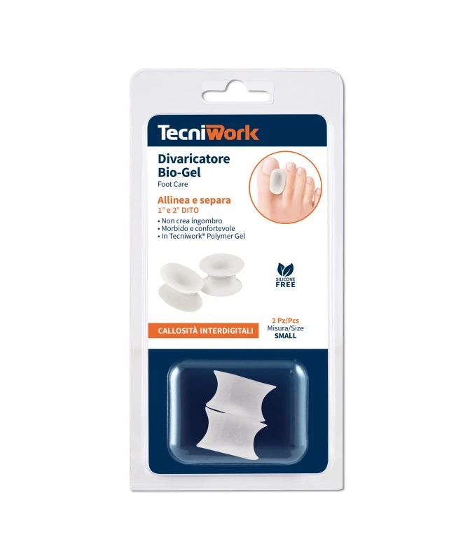 Divaricatore per dita in Tecniwork® Polymer Gel. Allinea l’alluce alle altre dita in caso di accavallamento, impedisce lo sfregamento tra 1° e 2° dito, evita la formazione di callosità interdigitali. Previene e dona sollievo dal dolore anche in caso di occhi di pernice, calli duri o molli, senza creare ingombro. Protezione per dita che procura sollievo immediato anche in caso di callosità interdigitali.