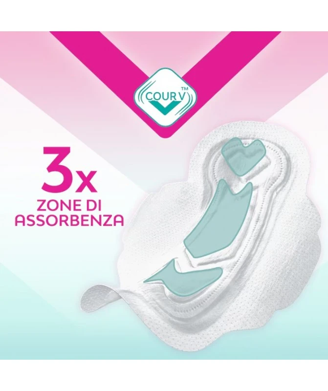 – Grazie alle 3 zone di assorbenza e le ali, la Max Cour-V™ body adaptive technology ti fa sentire asciutta durante tutta la notte